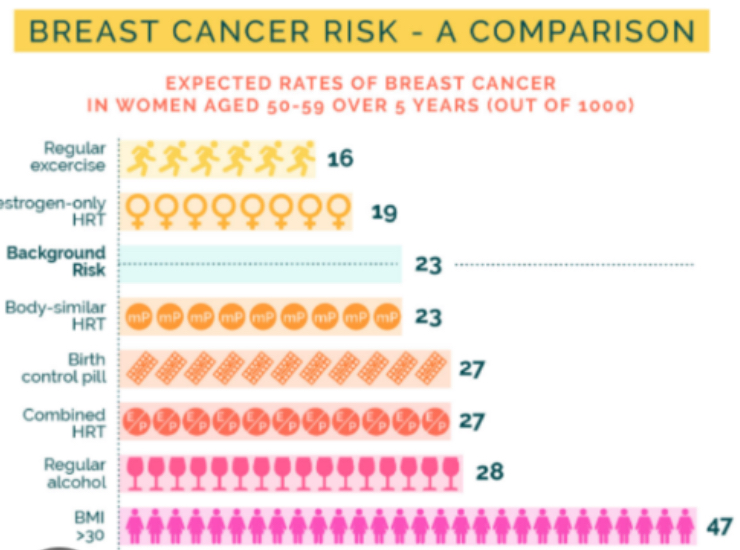- For women ages 50-59, combined MHT (estrogen and a progestogen) is associated with an additional 6-15 breast cancers per 10,000 women per year.
